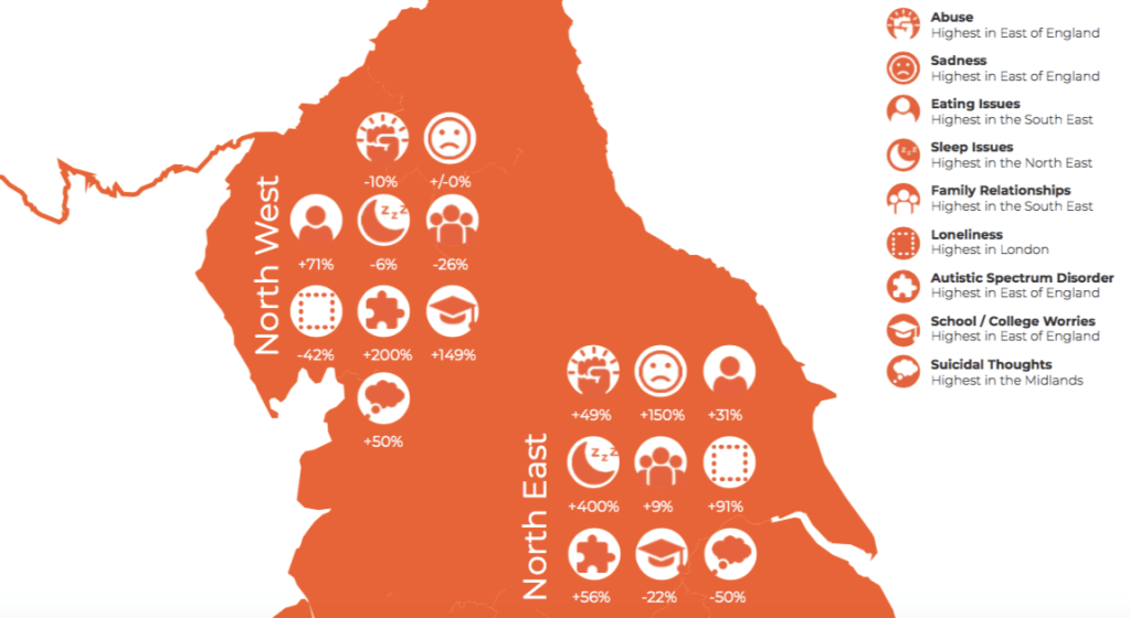 Kooth Infographics – suicidal thoughts rising. Highest in the Midlands.