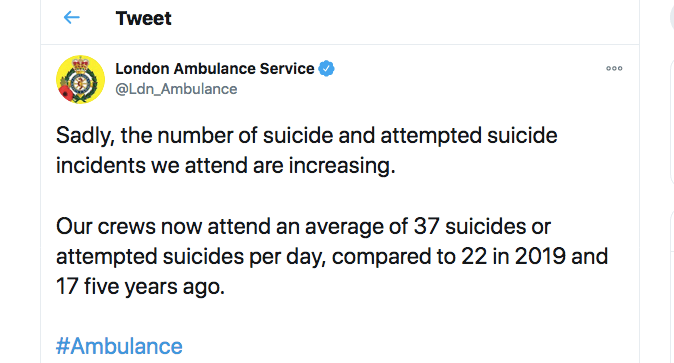 Over the last weeks and months, there have been thousands of job-losses, much sadness caused by separation and bereavement and much suffering due to limited social contacts and falling away of normal support systems. Perhaps explaining this tweet by London Ambulance Service.