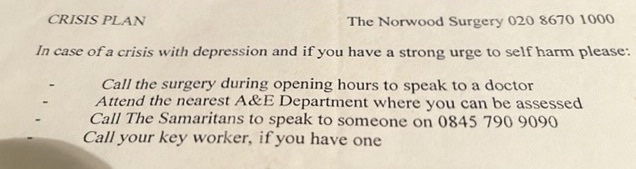 A Crisis Plan. Special features – Not worth two pennies. Highly ineffective. Not accompanied by a conversation. No detail. Not individualised. Not created in partnership with the patient. Not an alive document. Does not mention anything more than ‘self-harm’. Doesn’t tell us what ‘Crisis’ looks like. Doesn’t identify any helpful distractions, activities, friends or family. Doesn’t appear to know the patient, for example, a key fact – does this person have a key worker? Does not express any understanding or compassion.