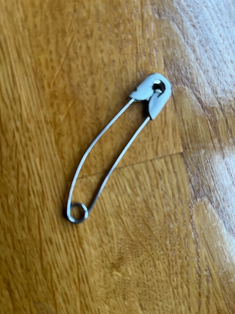 A nappy pin. Special feature – A white safety cap to prevent accidental opening up while the baby has his cloth nappy on. Commonly used in India and other developing countries. Original owner: Baby Saagar.