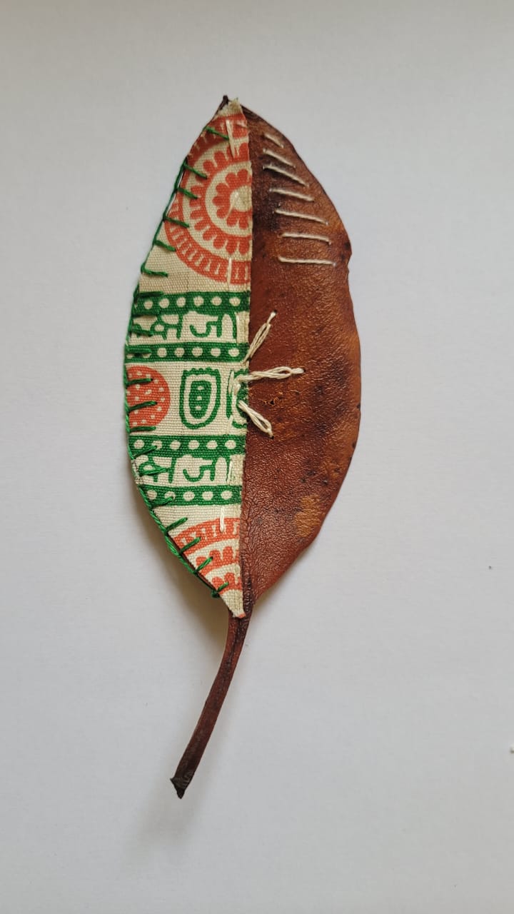 Walking on the edge of the Arabian sea, along the west coast of India, I see shapely leaves in orange, yellow, red and auburn strewn on the golden beach. I pick one up and it feels thick and waxy, seasoned well by its prolonged contact with salt water. Their shape is that of jack-fruit leaves. I can’t help but pick a few, hold them in the shallow waves as they get the sand off them, pat them dry against my cotton top and carefully bring them home. Press them under a sofa cushion and a few days later, they emerge flat and textured as a fabric, ready to receive some more colour.