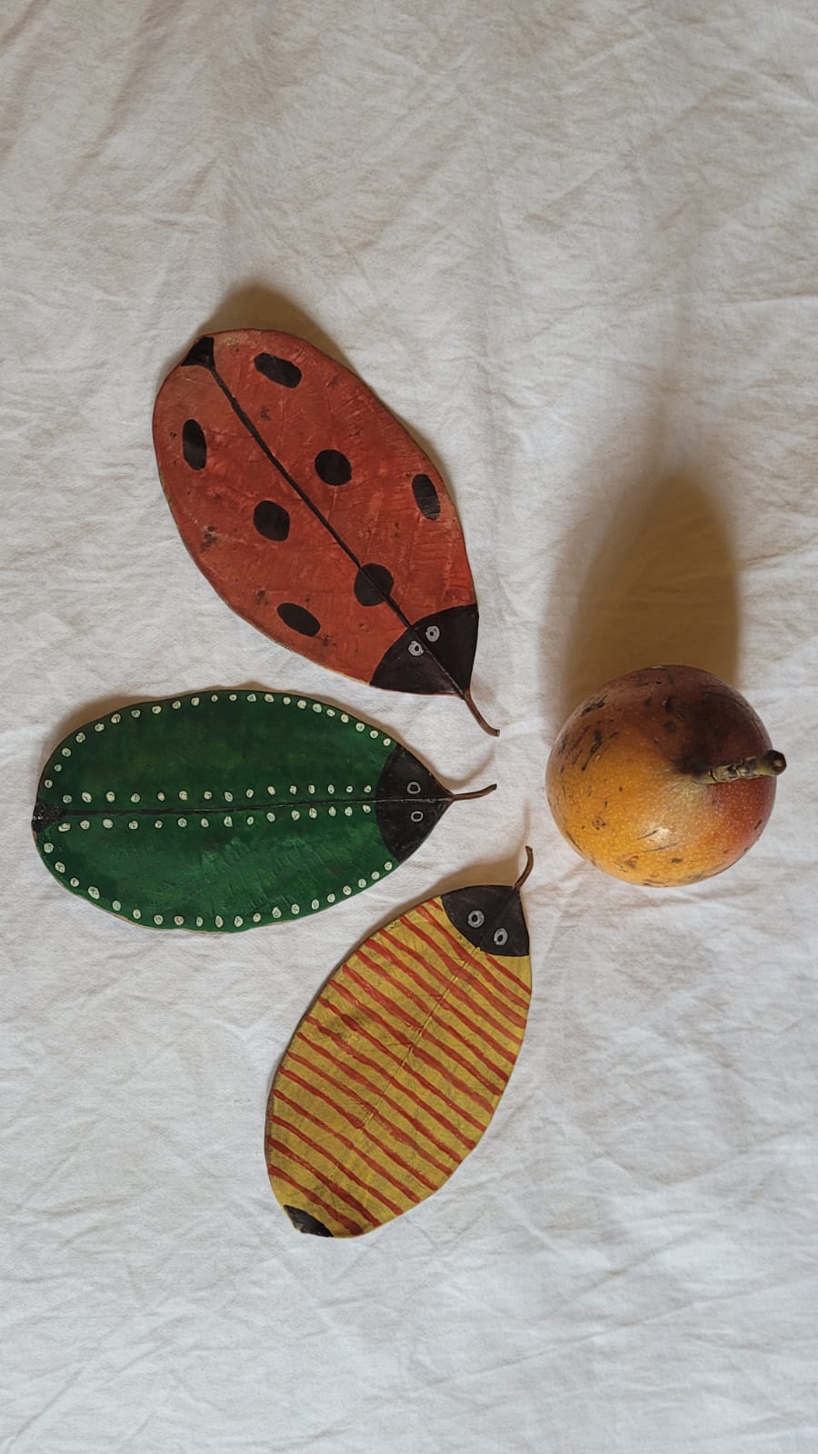 These plain fascinating leaves invite the five-years-old in me to play. I jump at the invitation and spend some timeless moments with them. Together we build little bugs and African shields. In our world, it doesn’t matter that the bug and the shield are the same size. It also doesn’t matter that these things have no practical use at all. The fact that they may not last for more than a few days as a possible bookmark or a decoration, also does not matter.