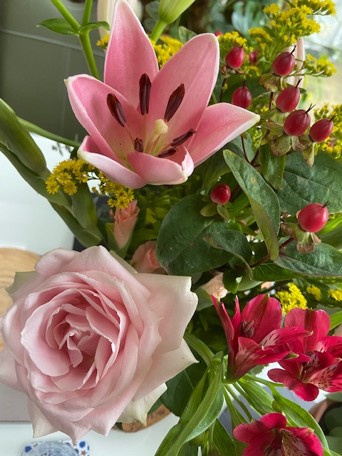 On my birthday last week, a bunch of Freddie’s flowers arrived unexpectedly. I thought I had cancelled that delivery but it seems I hadn’t. Roses, lilies and gladioli – but this time, they are a pretty pretty pink. Six days on, they are open and smiling and guess what … no heart-breaking fragrance.